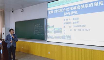 华中科技大学博士生董超强作题为:《絮凝-固化联合处理疏浚泥浆的强度特性研究》的报告