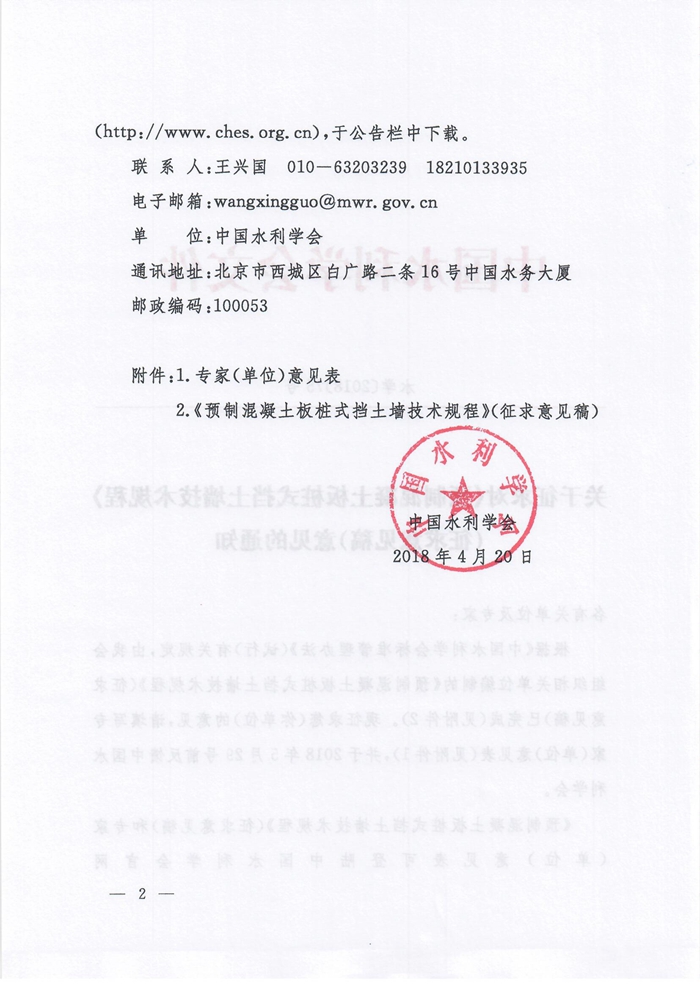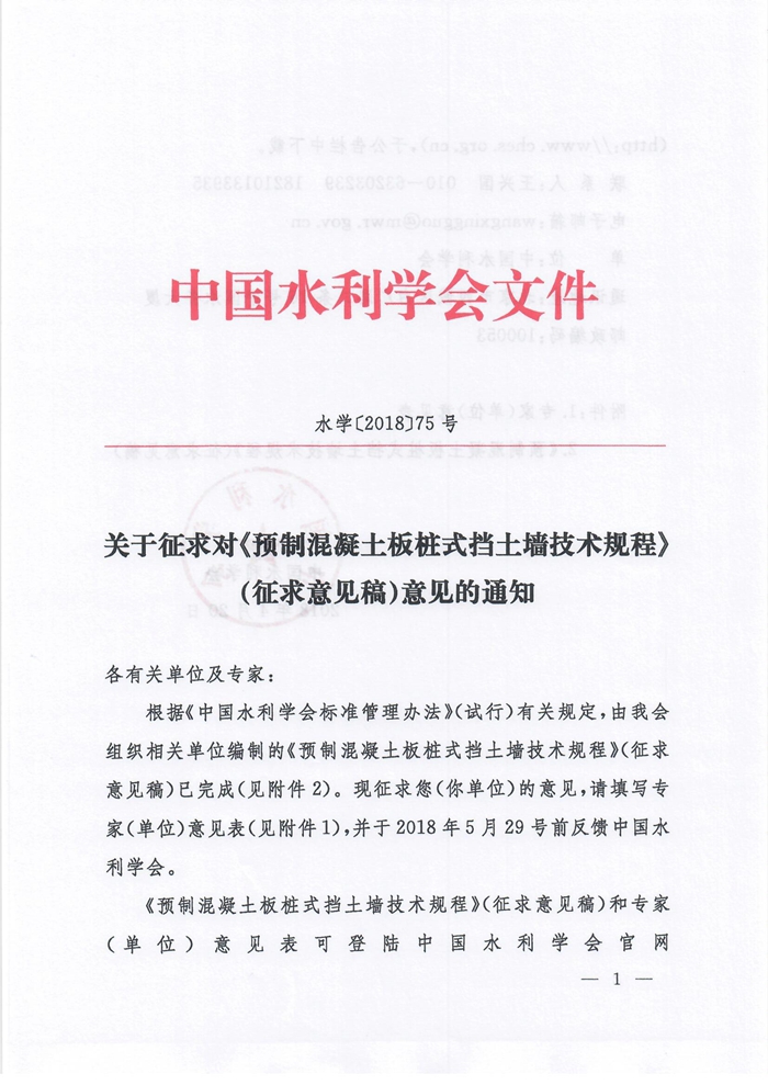 关于征求对《预制混凝土板桩式挡土墙技术规程》(征求意见稿)意见的通知