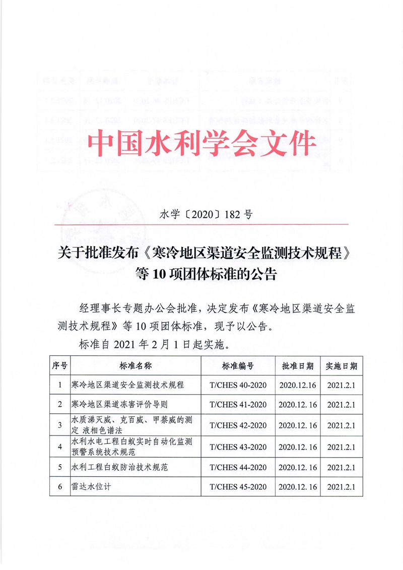 关于批准发布《寒冷地区渠道安全监测技术规程》等10项团体标准的公告