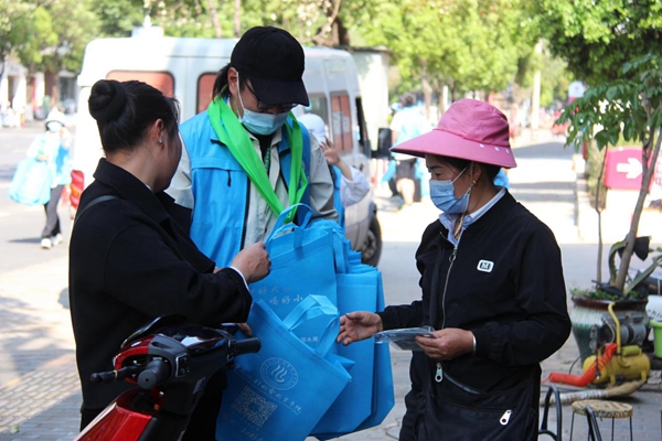 (志愿者在发放节约用水宣传袋)
