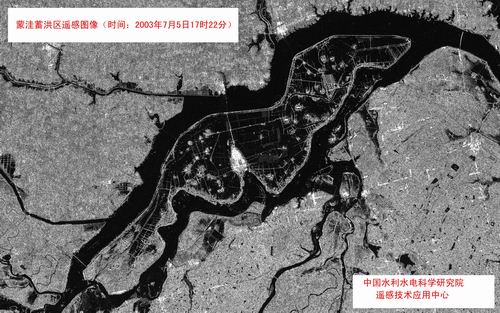 从遥感图像可以看到,蒙洼蓄洪区内大大小小140多个庄台和主要道路尚未被淹没;淮河干、支流河面增宽;流域中游内涝较严重;干流大堤无恙;城西湖和城东湖南部因内涝水体扩大。