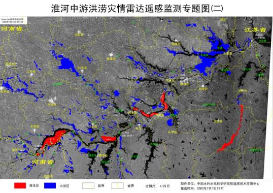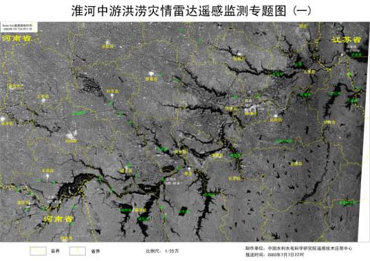 2003年7月7日利用加拿大Radarsat-1卫星 (北京时间早晨6时10分过境,空间分辩率25米)300km宽幅模式雷达图像对淮河中游西起河南省淮滨东至江苏省洪泽湖的洪涝灾情进行监测,较7月5日雷达监测幅�100km的范围要大。