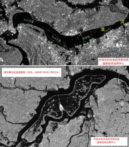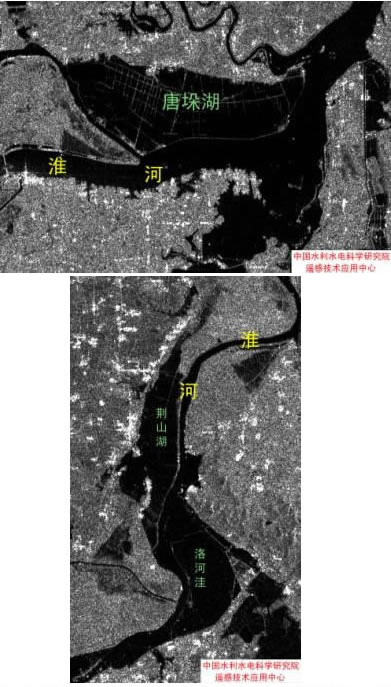 根据相关水文站观测,卫星过境时淮河干流王家坝水位28.23米,正阳关水位25.69米,蚌埠水位21.79米,洪泽湖水位13.77米。从遥感图像可以看到淮河干支流河面普遍涨水,河面增宽明显。至卫星监测时为止,除少数堤段有漫溢和人为破堤行洪以外,淮河干流大堤未发生大规模自然溃决。