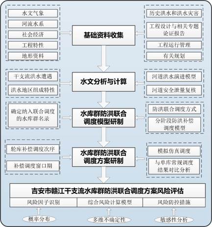 本项目以吉安市赣江干支流水库群系统为研究对象,开展面向吉安市中心城区防洪的区域水库群联合补偿调度及风险分析研究与应用,研究工作从以下三个方面展开: