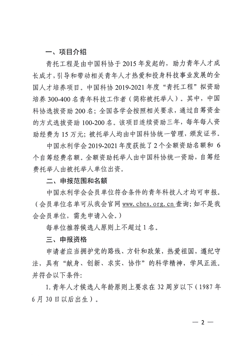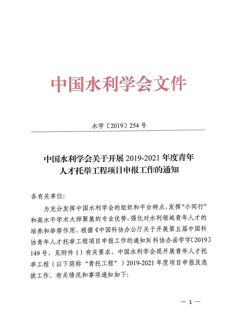 中国水利学会关于开展2019-2021年度青年人才托举工程项目申报工作的通知