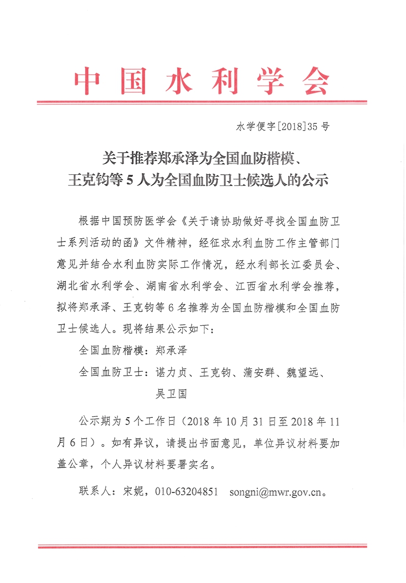 关于推荐郑承泽为全国血防楷模、王克钧等5人为全国血防卫士候选人的公示