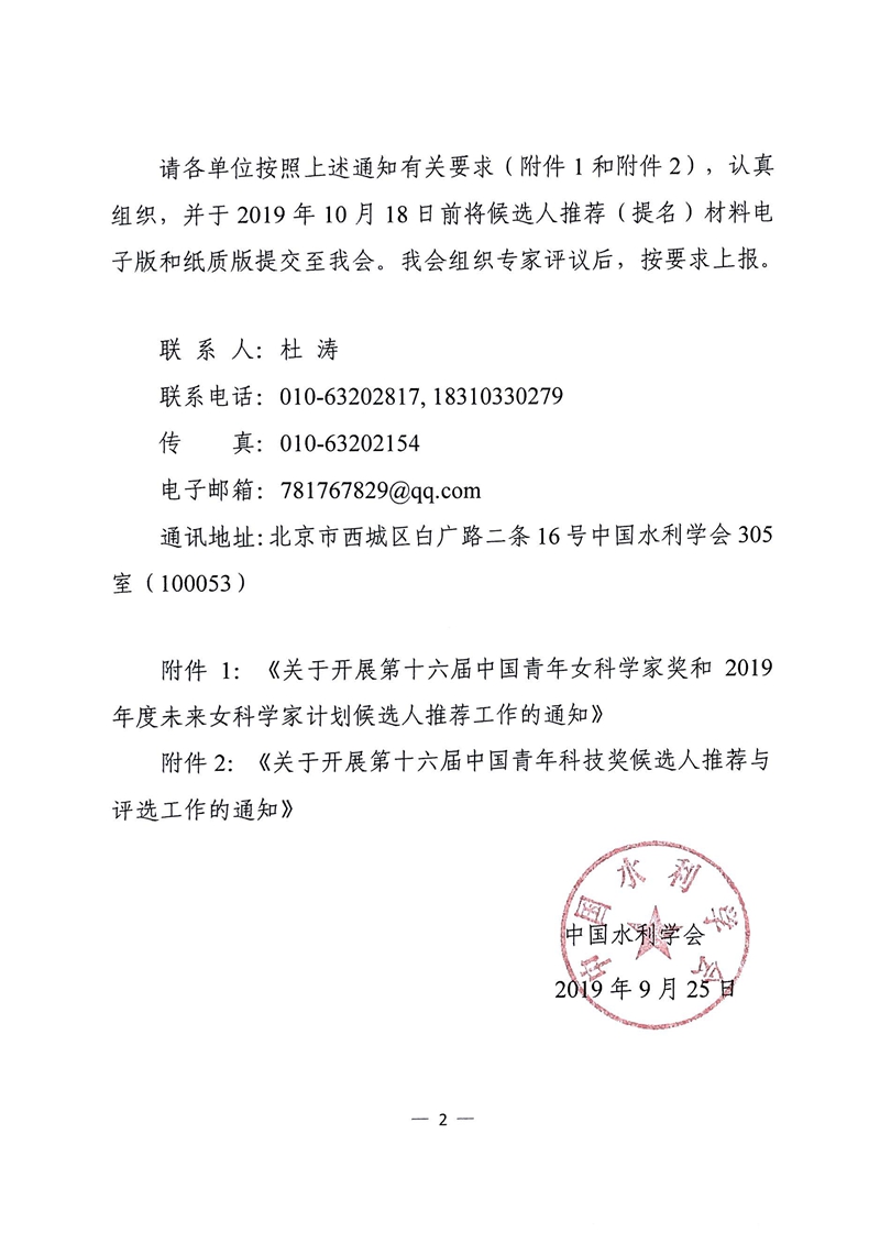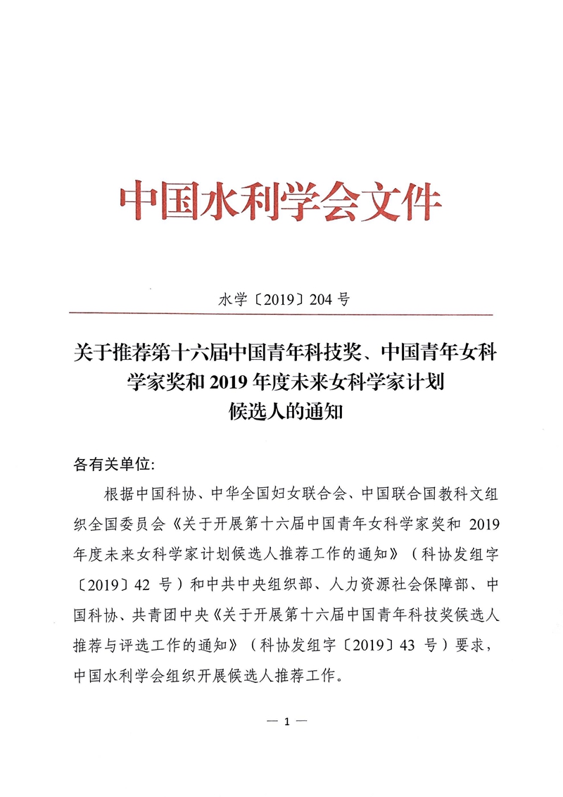 关于推荐第十六届中国青年科技奖、中国青年女科学家奖和2019年度未来女科学家计划候选人的通知