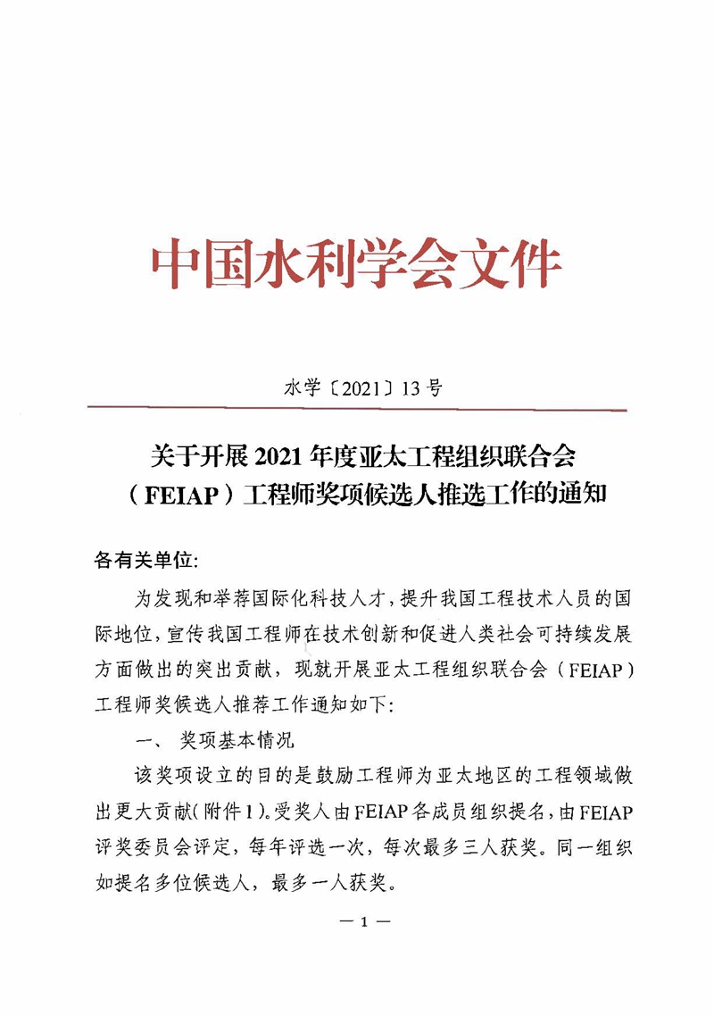 关于开展2021年度亚太工程组织联合会(FEIAP)工程师奖项候选人推选工作的通知