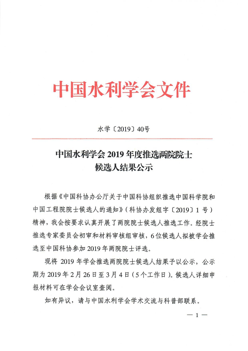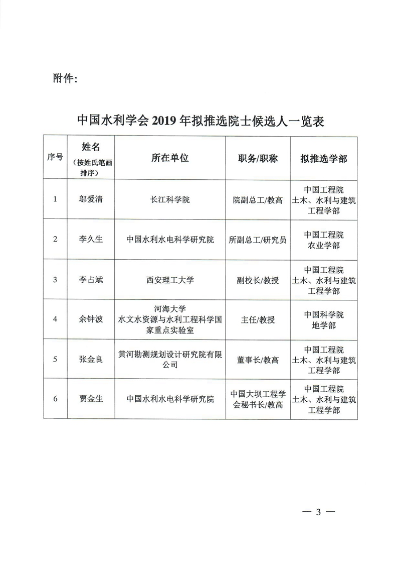 中国水利学会关于组织推选2019年中国科学院和中国工程院院士候选人的通知
