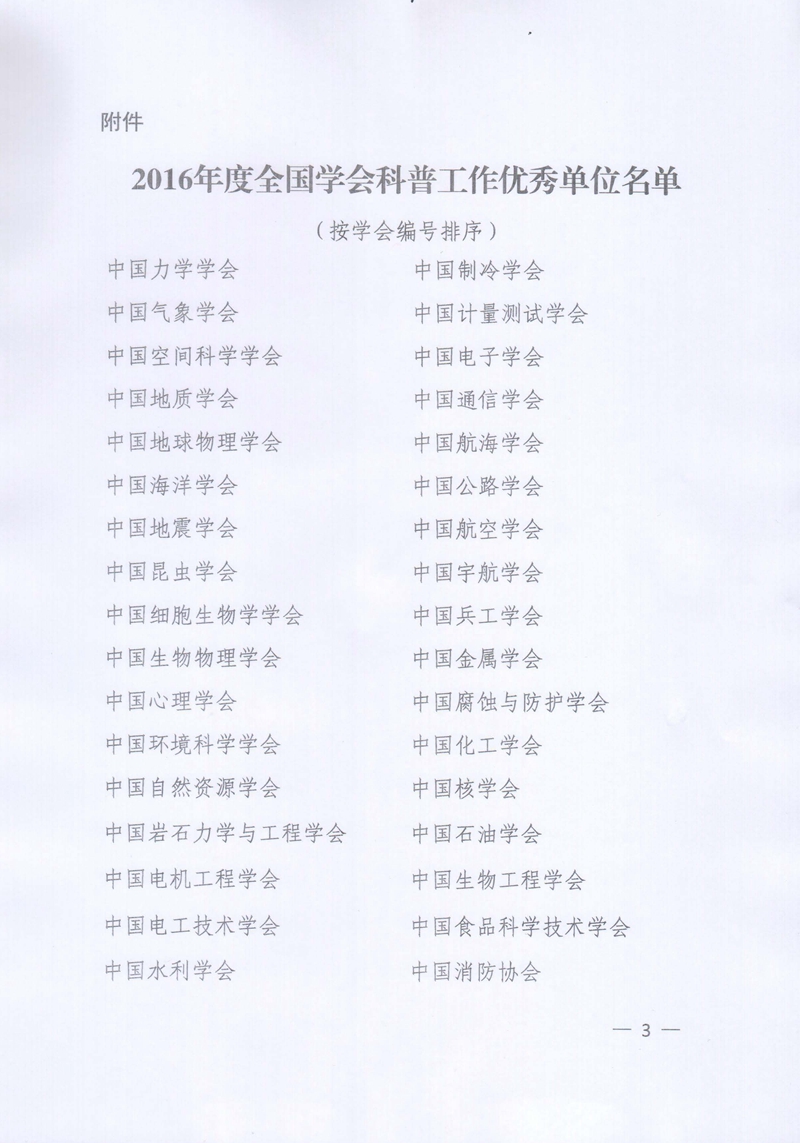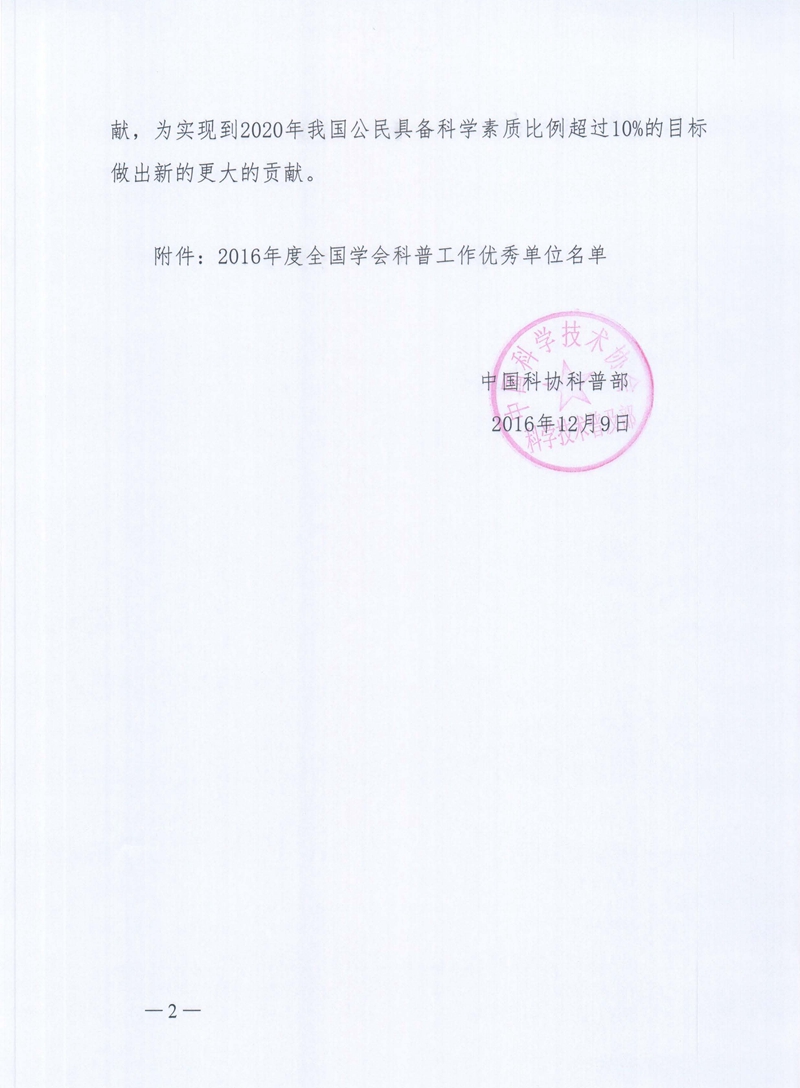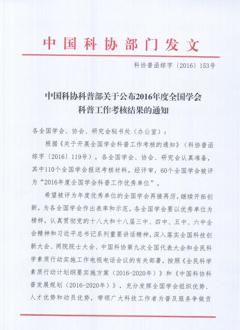12月9日,中国科协下发《中国科协科普部关于公布2016年度全国学会科普工作考核结果的通知》(科协普函综字[2016]153号),中国水利学会荣获“中国科协2016年度全国学会科普工作优秀单位”称号。