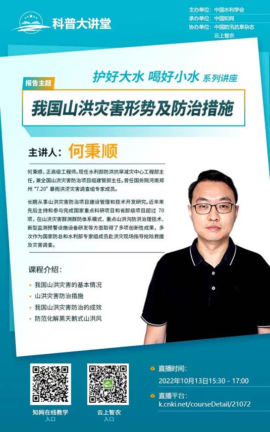 2022年10月13日是第33个国际减灾日,主题是“早预警、早行动”。为提高全社会灾害风险防范应对能力,中国水利学会邀请水利部防洪抗旱减灾中心工程部主任兼全国山洪灾害防治项目组建管部主任何秉顺正高级工程师作题为“我国山洪灾害形势及防治措施”的线上科普讲座。本次讲座也是中国水利学会“护好大水、喝好小水”系列讲座之一,5300余人次通过“腾讯会议”“中国知网”“云上智农”等云平台观看和学习。